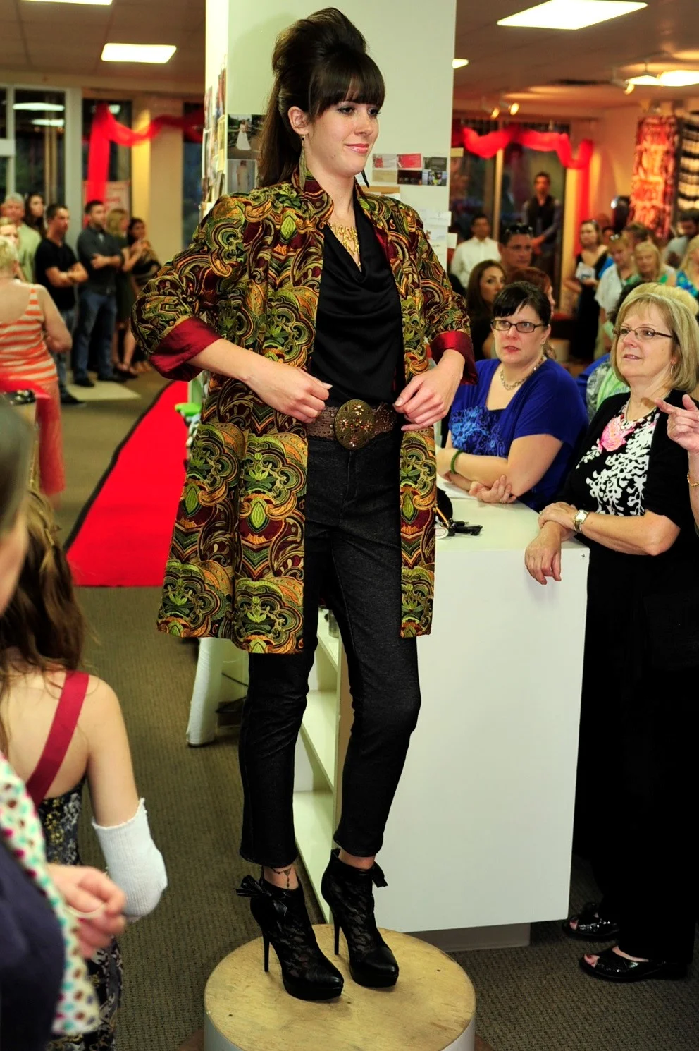 Embroidered, fitted silk jacket with a mandarian collar, lined in red dupioni silk. Black jersey knit top with a draped neckline and Black denim knit skinny jeans.